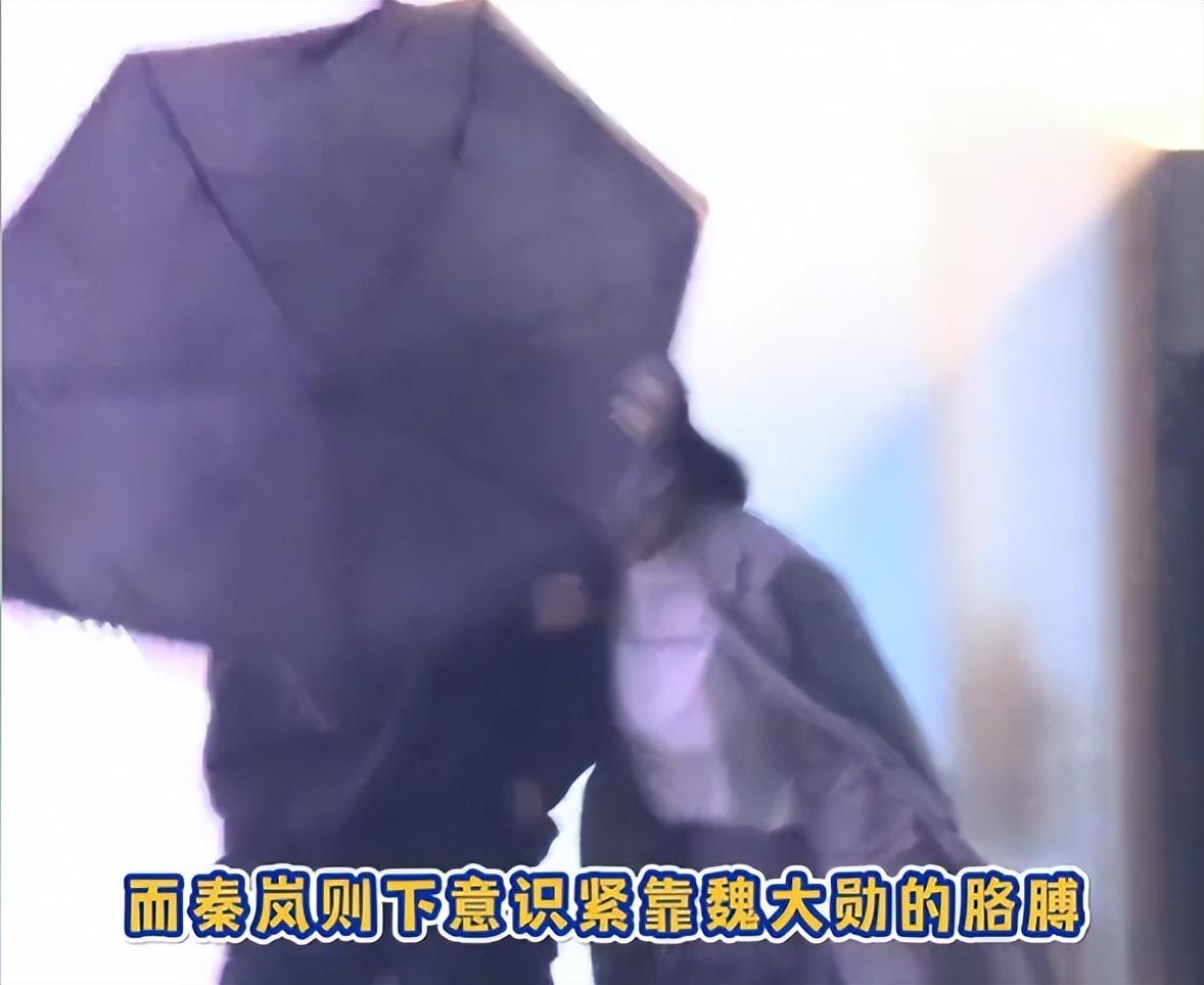 一阵风吹过来,秦岚下意识靠近魏大勋怀里,看着伞被吹翻,魏大勋率先挡住秦岚的方向,快速将伞调整好。画面看起来虽然有点搞笑,但小细节还是能看出魏大勋十分呵护秦岚。
